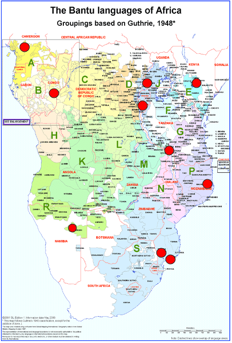 The Bantu languages number around 550, all spoken in the area between Cameroon, Kenya, and South Africa (see map). Nurse and Philippson (2003) refer to an estimate of about 240 million speakers of Bantu languages – one in three Africans! Guthrie (1948) classified these into groups, indicated by a letter (geographical and partly genealogical zone) and a number (subgroup and language). This system is still used in referring to the Bantu languages.